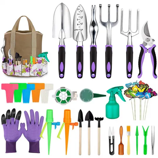 83 piese Seturi de scule de gradina cu geanta organizatoare de instrumente de gradina cu maner ergonomic antiderapant, cadou pentru gradinari si gradinari, inox, WALALLA, multicolor Violet