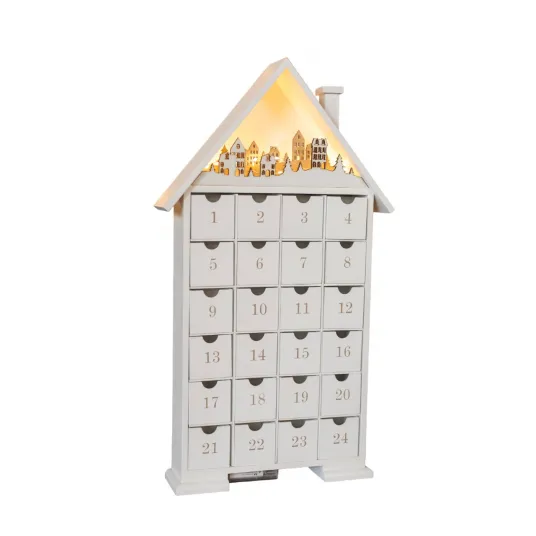 Advent Calendar, BraysDecor, 79x29 cm, 24 Sertare, Luminite Led Incorporate, Baterii 3 tip AA, MDF, Alb