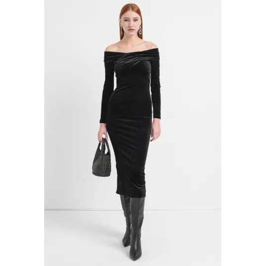 AllSaints, Rochie midi cu aspect de catifea si decolteu pe umeri, Negru, 4AllSaints, Rochie midi cu aspect de catifea si decolteu pe umeri, Negru, 4223774013223774013