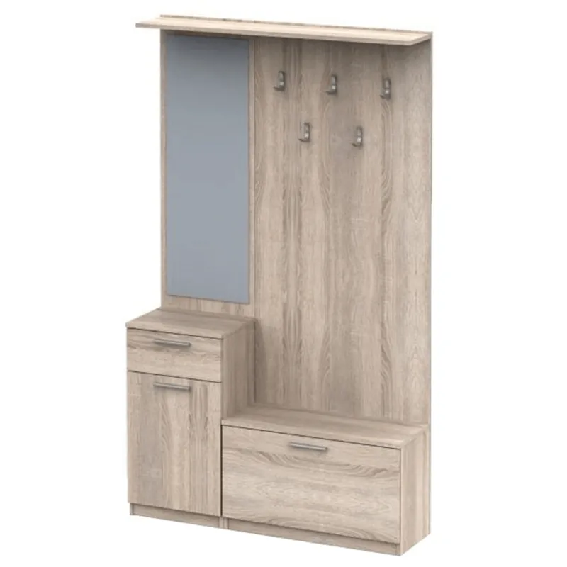 Ansamblu pentru hol NOKO-SINGA 04 Material: PAL melaminat Finisaj: stejar sonoma Dimensiuni (lxhxA): 111x185,5x30 cm Grosimea materialului: 16 mm Se livreaza demontat.