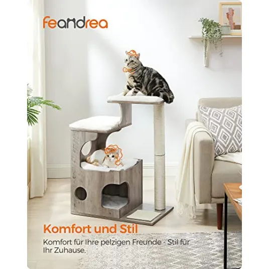 Ansamblu pisici, Feandrea, Gri, 66x42x88 cmAduce mai mult stil: furnirul din lemn de culoare greaca al acestui suport de zgariere si tampoanele din blana alba contrastanta confera mobilierului pentru pisici mai mult stil<br><br>Usor de curatat: pernele de plus alb si dragalas sunt atasate la platforme sau in interiorul casei cu ajutorul unui fermoar Velcro. De asemenea, acestea sunt usor de indepartat si pot fi curatate cu usurinta<br><br>Pentru mai multa distractie: pe una dintre platformele generoase ale casei pentru pisici sau in pestera spatioasa pentru pisici? Indiferent de locul ales de pisica dvs., copacul pentru pisici ofera stabilitate maxima peste tot, datorita placilor robuste din MDF<br><br>Pentru ascutirea ghearelor: trunchiul acestui scarpinator pentru pisici este complet infasurat in sisal. La fel ca si pe micul covoras de zgariat, pisica dvs. isi poate ascuti ghearele dupa bunul plac - mai bine decat pe canapeaua dvs., nu-i asa?<br><br>Usor si stabil: datorita pieselor etichetate si instructiunilor clare (limba engleza nu este garantata), puteti asambla rapid acest copac pentru pisici. Acest copac pentru pisici are o baza solida si o protectie impotriva inclinarii, astfel incat dragutul dvs. pachet de energie sa poata sari in jurul valorii de salbaticie224198579224198579