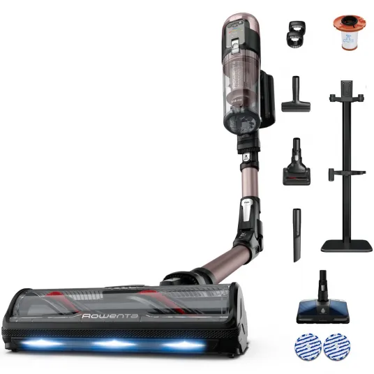 Aspirator vertical Rowenta X-Force Flex 16.60 Aqua RH9CD9E0 cu mop, 780W, autonomie 120 min, filtrare 99.9%, recipient 0.65L, tub flexibil, perie cu tehnologie anti-incurcare & LED, panou Smart Control, statie incarcare cu suport accesorii, roz & Negru