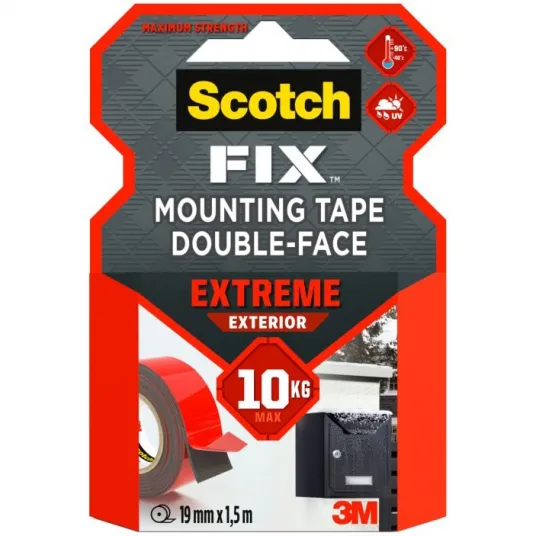 Banda dublu adeziva montare exterior, 19mmx1.5m, Scotch-Fix™ Extreme 3M Banda de montare exterioara Scotch-Fix™ Extreme cu tehnologie avansata 3M™.Sustinand pana la 10 kg, aceasta banda permanenta superioara, conformabila, este destinata utilizarii extreme in exterior si este ideala pe gips-carton vopsit, lemn vopsit/finisat, metal, acril, piatra neteda si beton vopsit. Rezistenta sporita la factori extremi de mediu (temperaturi intre -40 si +90 grade Celsius, umiditate sporita). Protectie UV.Dimensiuni: 19 mm x 1,5 m.