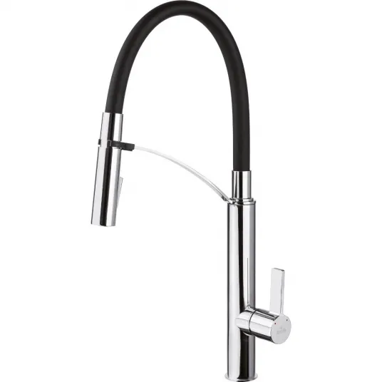 Baterie bucatarie Deante Gerbera, pipa extractibila/flexibila, dus de mana cu 2 functii, monocomanda, cu aerator, cartus ceramic, clasa debit Z 4-9 l/min, furtunuri racordare incluse, Negru/Crom