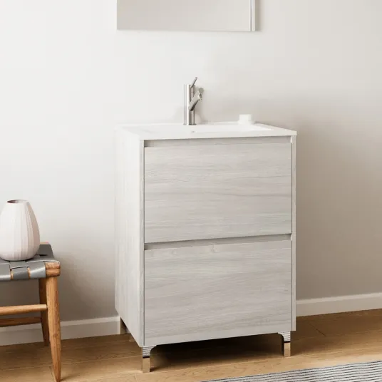 Baza mobilier pe picioare Kring Lisbona cu 2 sertare, inchidere amortizata si lavoar ceramic, PAL melaminat stejar gri, 61x46.5x86cm