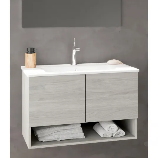 Baza mobilier suspendat Kring Oslo cu 2 usi, inchidere amortizata, compartiment deschis si lavoar ceramic, PAL melaminat stejar gri, 81x46.5x53cm