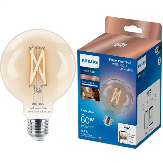Bec LED inteligent vintage Philips filament transparent, Wi-Fi, Bluetooth, G95, E27, 7W (60W), 806 lm, temperatura lumina reglabila (2700-6500K), 9.5cm