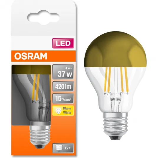 Bec LED Osram cu oglinda, filament, A60, E27, 4W (37W), 420 lm, lumina calda (2700K), Auriu, clasa energetica F