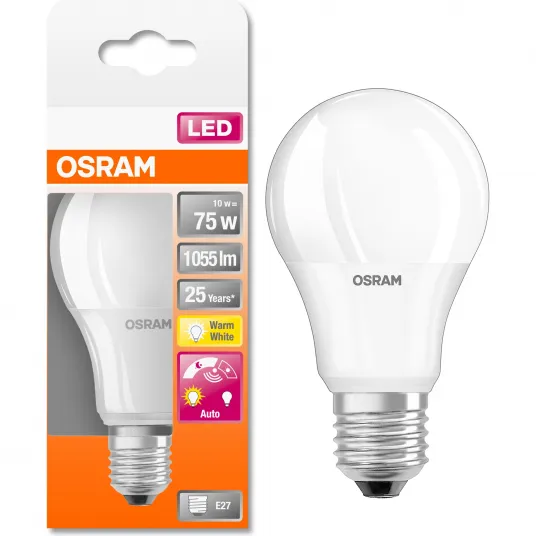 Bec LED Osram LED STAR+, A75, cu senzor de lumina, E27, 10W (75W), 1055 lm, lumina calda (2700K), clasa energetica F