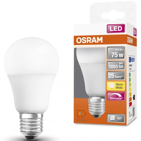 Bec LED OSRAM Superstar, A75, E27, 10.5W (75W), 1055 lm, dimabil, lumina calda (2700K), clasa energetica F