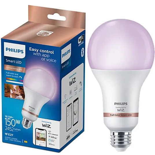 Bec LED RGB inteligent Philips Smart, Wi-Fi, E27, 18.5W (150W), 2452 lm, lumina alba si colorata (2200-6500K), control vocal