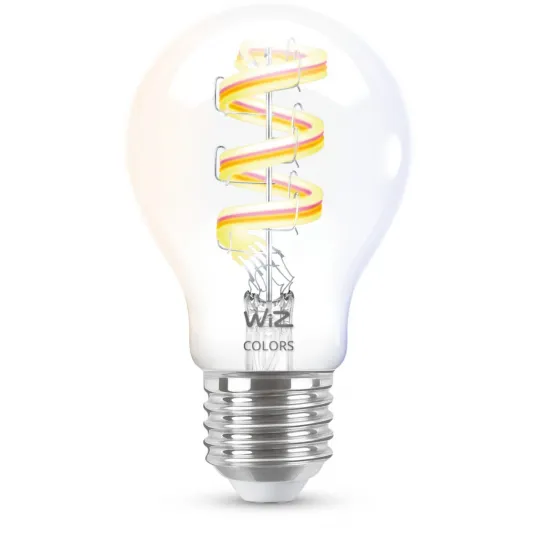 Bec LED RGB inteligent WiZ A60, Wi-Fi/Bluetooth, E27, 6.3W (40W), 470 lm, lumina alba si colorata (2200-6500K), clasa energetica G, transparent