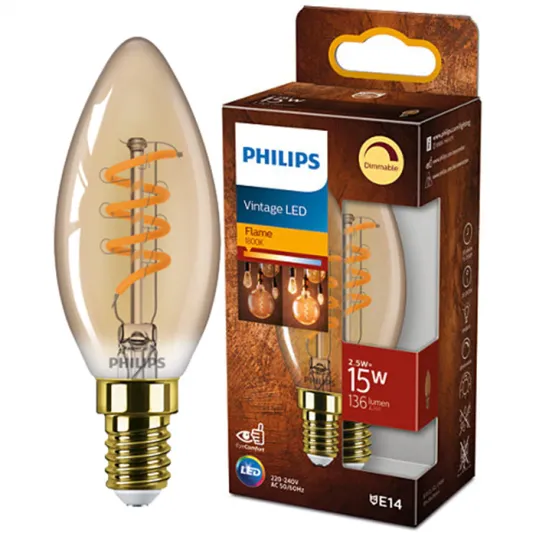 Bec LED vintage Philips Classic B35, intensitate luminosa reglabila (dimabil), E14, 2.5W (15W), 136 lm, lumina calda tip flacara (1800K), Auriu