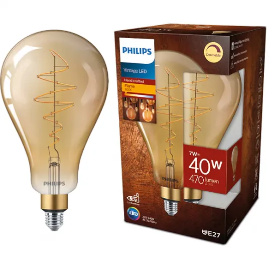 Bec LED vintage Philips Classic-Giant A160, intensitate luminosa reglabila (dimabil), E27, 7W (40W), 470 lm, lumina calda tip flacara (1800K), Auriu, 29.3x16.2 cm