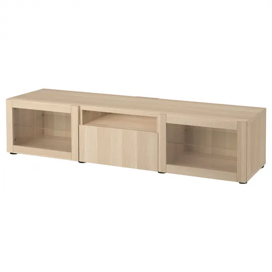 IKEA BESTA Comoda TV, aspect stejar antichizat/Lappviken sticla transp. aspect stejar alb, 180x42x39 cm