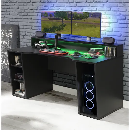 - Solutii de stocare: Pastrati-va zona de joc organizata si fara dezordine cu optiunile de stocare incorporate ale biroului. Biroul are rafturi si compartimente in care iti poti depozita accesoriile de gaming, tinandu-le la indemana in orice moment.