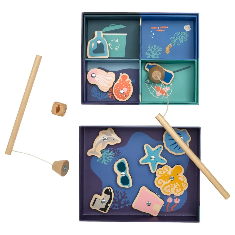 Include: 1 zar, 2 undite pentru pescuit si 11 figurine diferite (animale si creaturi din ocean, precum si deseuri care trebuie colectate si reciclate).