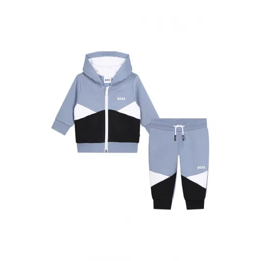 BOSS Kidswear, Costum sport cu gluga si model colorblock, Albastru prafuit, 71 CMBOSS Kidswear, Costum sport cu gluga si model colorblock, Albastru prafuit, 71 CM223222048223222048