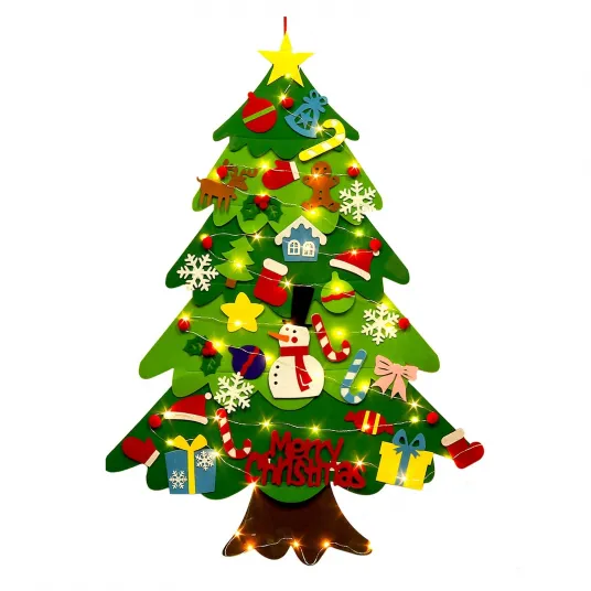 Brad de Craciun din fetru, Zggzerg, Cu 32 de ornamente detasabile si sir de lumini, Creati cadouri magice de bricolaj pentru copii mici, pentru perete agatat decoratiuni, 69 x 100cm, Multicolor