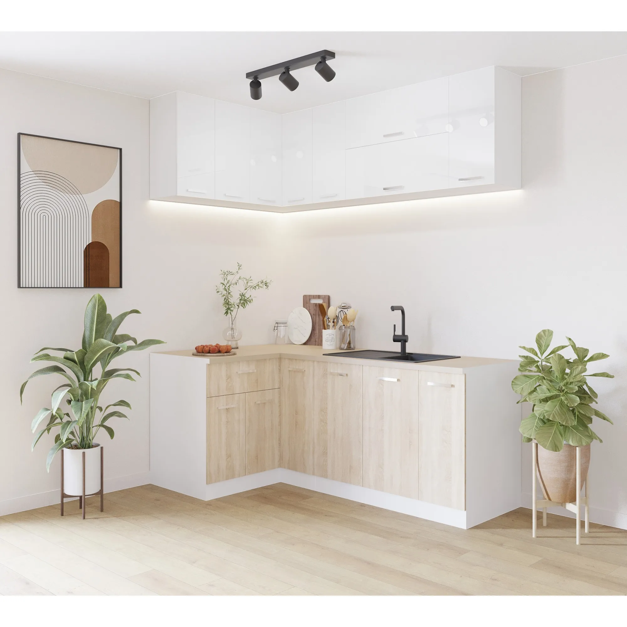 Bucataria de colt Kring Harmony cu 9 module este dimensionata perfect pentru a se potrivi perfect in coltul bucatariei dvs. La 120/200x195x60cm, ofera spatiu amplu de depozitare pentru a va mentine toate lucrurile esentiale din bucatarie bine organizate si usor de accesat. Bucataria este disponibila intr-un finisaj fermecator alb si stejar Sonoma, ceea ce ii confera un aspect modern si elegant, care este perfect pentru orice stil de decor al bucatariei.