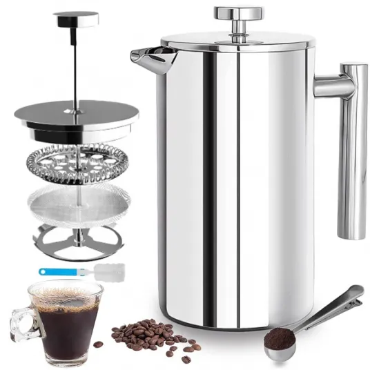 Cafetiera cu presa franceza, ExcitatВ®, Capacitate 1000ml, din otel inoxidabil, cu lingura de masurare, perie de curatare cu burete, Argintiu