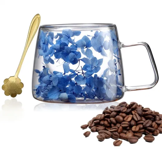 Cana Fantasy, Lingura de AmestecatпјЊPerete Dublu Izolant, Decor Flori Uscate Hortensie, Transparent cu Albastru, Rezistente Ia Caldura, Cani de Baut, Cani de CafeaпјЊCadouri de SarbatoriпјЊ200ml