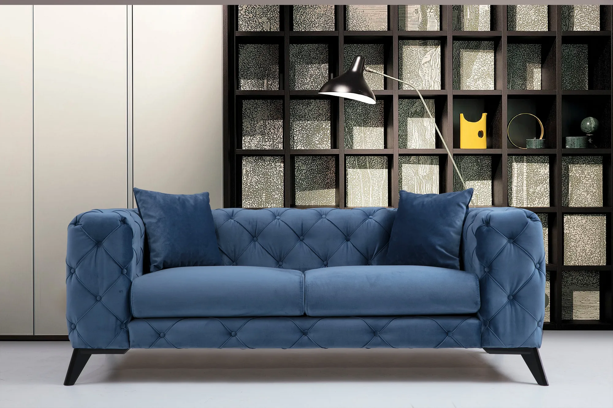 Cu designul sau elegant si modern, canapeaua noastra cu 2 locuri este intruchiparea rafinamentului. Culoarea albastra solida adauga o nota de eleganta oricarei incaperi, in timp ce picioarele metalice negre ofera un aspect contemporan si elegant.