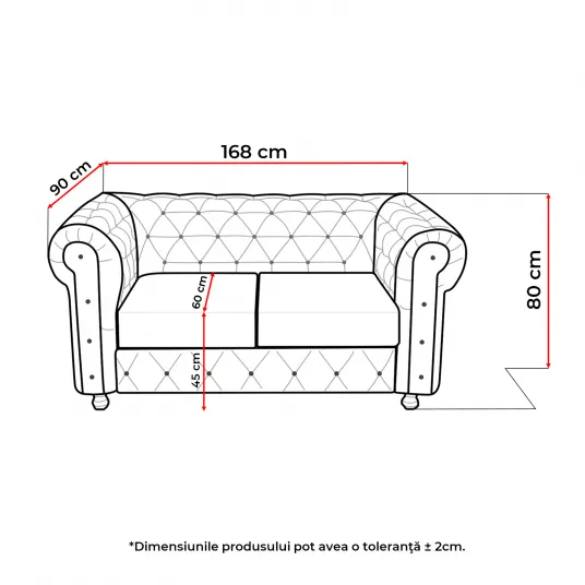 Dimensiuni canapea (gabarit): , Lungime: 168 cm , Adancime: 90 cm , Inaltime totala: 80 cm , Adancime sezut: 60 cm , Inaltime sezut: 45 cm , Numar de locuri recomandat: 2 Materiale: , Picioare lemn masiv , Rama schelet lemn masiv , Elemente PAL si PFL , Arcuri tip bonnel: grosime sarma 2.4 mm, inaltime plasa 11 cm , Minet Vatelina 150g m ² , Pasla Feltru 1200g m ² , Spuma poliuretanica (burete) , Material acoperire: Piele Ecologica Stofa , Accesorii PVC Avantajele produsului: , Nasturi decorativi , Certificate: ISO 9001, 14001 Informatii suplimentare: , Numar colete: 1 , Greutate totala: , ˆ60 kg , Origine: Romania