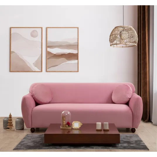 Realizata cu un cadru robust din lemn de fag si placi aglomerate, aceasta canapea este construita pentru a rezista in timp. Picioarele din lemn de nuc adauga o nota de rafinament, in timp ce tesatura din 100% poliester intr-o frumoasa culoare dusty rose emana eleganta si farmec.