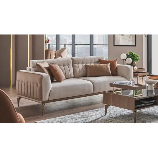 Set de canapea pentru camera de zi Setul de mobilier tapitat este realizat cu ajutorul tehnologiei hibride, pentru a oferi un plus de confort. Scaunele au o umplutura din spuma poliuretanica compozita, combinata cu arcuri cu buzunare independente. Deasupra stratului de arcuri se foloseste spuma poliuretanica de inalta calitate cu densitate 32 DNS. Pe partile laterale ale cotierelor se foloseste o tesatura speciala de imitatie nubuc. Spatarul canapelei cu trei locuri si al celei cu doua locuri poate fi tras in fata si in spate. Acest lucru va permite sa reglati adancimea de sedere si, de asemenea, creeaza un pat simplu. Colectia Likya este proiectata intr-un stil sportiv si luxos. Canapelele au un cadru din lemn. Picioarele colectiei sunt realizate din metal cu elemente aurii. Poate fi comandata in alte tapiterii din catalogul de tesaturi din showroom Fabricat in Turcia Articol: 3120009580