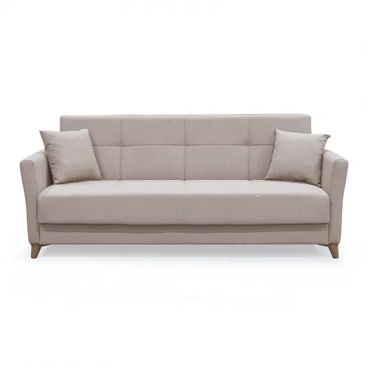 Canapea LOREN extensibila, 3 locuri, cu arcuri si lada depozitare, bej, 203x85x85 cmSuprafata de dormit: , Lungime: 180 cm , Latime: 110 cm Dimensiuni canapea (gabarit): , Lungime: 203 cm , Adancime totala: 85 cm , Adancime sezut: 55 cm , Inaltime totala: 85 cm , Inaltime sezut: 44 cm , Numar de locuri recomandat: 3 Materiale: , Lemn masiv , Elemente PAL si PFL , Sezut cu arcuri tip bonnel: grosime sarma 2.4 mm , Minet 150g m ² , Pasla 1200g m ² , Spuma poliuretanica (burete) , Material acoperire: Stofa , Accesorii PVC Avantajele produsului: , Perne decorative incluse , Sistem de extindere click-clack , Lada depozitare din PAL melaminat , Certificate: ISO 9001, 14001 Informatii suplimentare: , Numar colete: 1 , Origine: Turcia224184236224184236