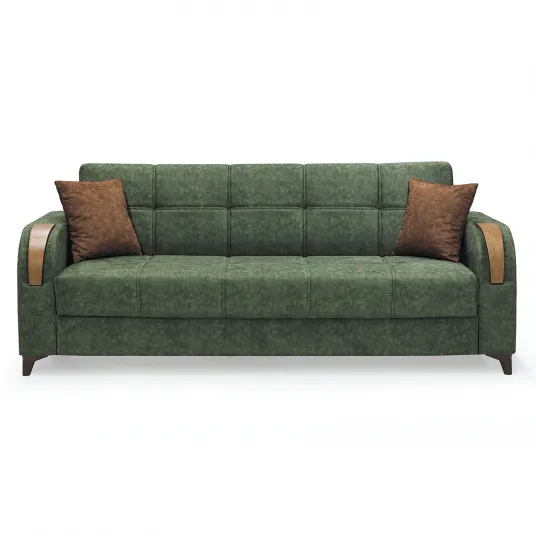 Canapea ZETA extensibila, 3 locuri, cu arcuri si lada depozitare, verde + maro, 225x84x85 cmSuprafata de dormit: , Lungime: 190 cm , Latime: 110 cm Dimensiuni canapea (gabarit): , Lungime: 225 cm , Adancime totala: 84 cm , Inaltime totala: 85 cm , Inaltime sezut: 47 cm Materiale: , Stofa , PAL , MDF , Metal , Cherestea lemn Avantajele produsului: , Numar de locuri: 3 , Arcuri , Extensibila , Lada depozitare din PAL , Design elegant , Picioare din PVC , Perne decorative incluse Informatii suplimentare: , Numar colete: 1 , Origine: Produs in Turcia Vezi Instructiuni de Utilizare224184174224184174