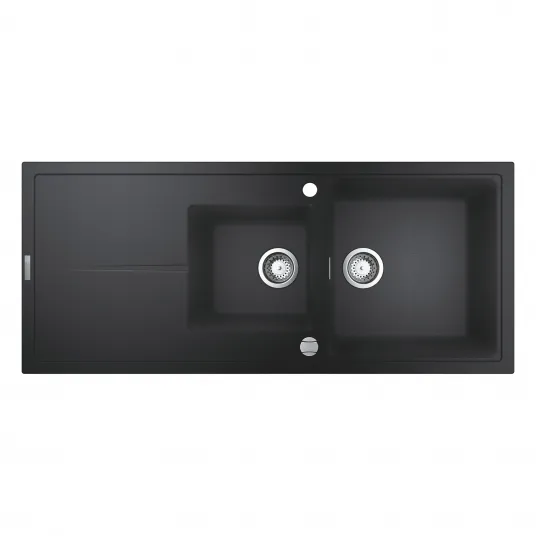 Chiuveta compozit Grohe K400 31643AP0, 1160x500 mm, reversibil, 2 boluri, montare pe blat, evacuare automata, Kit montaj si evacuare inclus, Negru granit