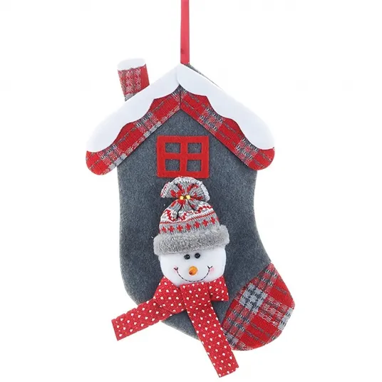Ciorap Cadouri, model casa, culoare gri, imprimeu om de zapada, marimea 20x27 cm