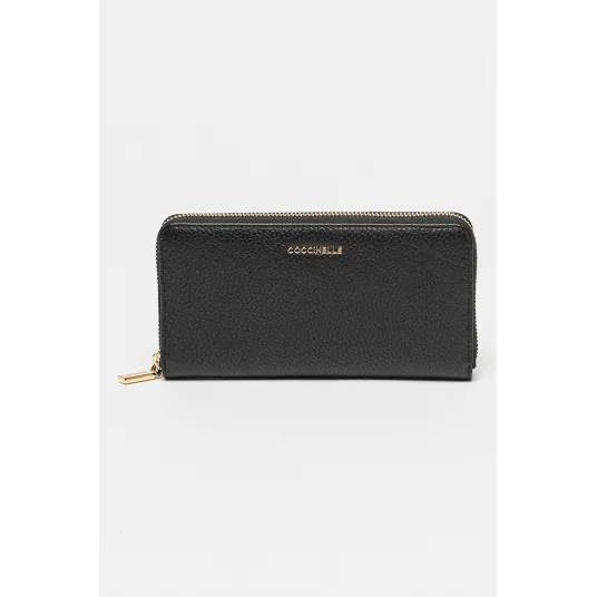 COCCINELLE, Portofel de piele cu fermoar si aspect granulat, Negru