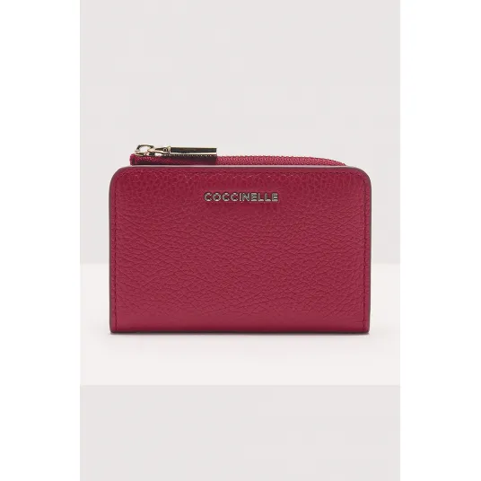 COCCINELLE, Portofel de piele fina texturata cu aspect metalizat, Rosu inchis