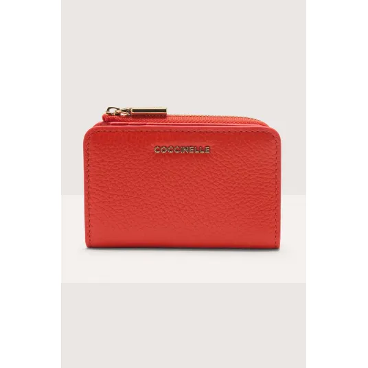 COCCINELLE, Portofel de piele fina texturata cu aspect metalizat, Rosu vermillion