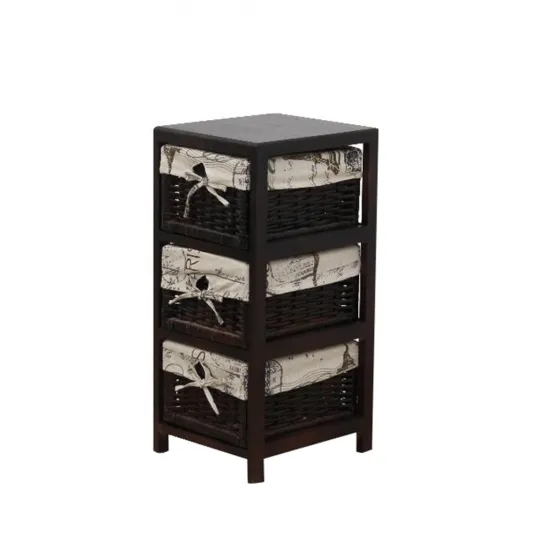 Comoda cu 3 cosuri de rachita intr-un cadru solid din lemn, Culoare: maro inchis, Material: lemn maro inchis rachita maro inchis material textil bej, Dimensiuni (lxhxA): 28,5x65,5x33 cm.