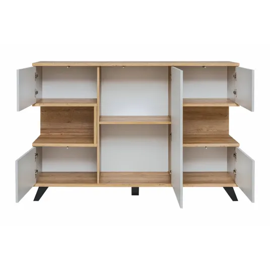 Comoda moderna Fabricata din pal stejar si fronturi gri mat picioare negre . Spatiu mare depozitare si design unicat. Calitate , feronerie de calitate . Deschidere usi push open , prin apasare . Dimensiuni : 160 cm lungime x 106 cm inaltime x 40 cm adancime . Ideala pentru aproape orice spatiu si incapere . Se livreaza neasamblata in colete. Coletele contin tot ce este necesar pentru asamblare ,piese , accesorii, schita de asamblare , usor de asamblat.