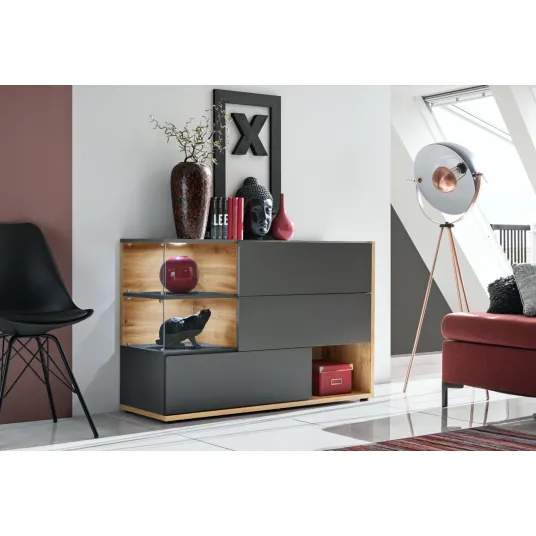 Comoda moderna, 120x77x40 cm, gri antracit cu stejar artisan, cu 3 usi, vitrina sticla securizata, si spatiu gol. Fronturi pvc de calitate premium. Cu led in vitrina ! Lumina alba. Fabricata din pal stejar wotan si fronturi sticla securizata si pal pvc gri grafit . Material mat . Spatiu mare depozitare si design unicat. Calitate , feronerie de calitate . Deschidere usi push open , prin apasare . Dimensiuni : 120 cm lungime x 77 cm inaltime x 40 cm adancime . Ideala pentru aproape orice spatiu si incapere . Se livreaza neasamblata in colete. Coletele contin tot ce este necesar pentru asamblare ,piese , accesorii, schita de asamblare , usor de asamblat. Decoratiunile si obiectele din imagini sunt doar pentru decor , nu sunt incluse in pret !
