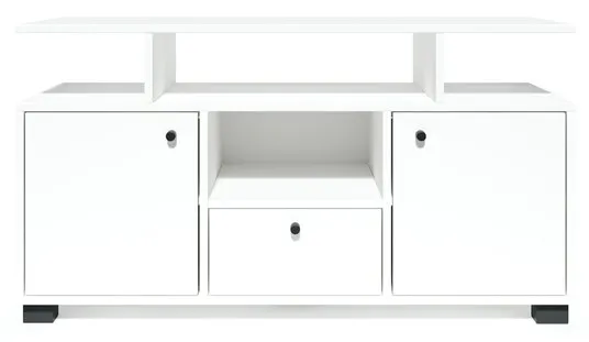 Comoda TV Fabrik Home Forever Alb Frasin se mandreste cu spatiu de depozitare amplu, ceea ce il face o alegere ideala pentru cei care doresc sa-si pastreze spatiul de locuit organizat si fara dezordine. Cu un blat spatios, gazduieste cu usurinta televizorul tau, in timp ce cele doua compartimente laterale ofera spatiu amplu pentru depozitarea dispozitivelor media si a altor articole esentiale. Compartimentul deschis din mijloc este perfect pentru a va expune piesele sau cartile preferate de decor.