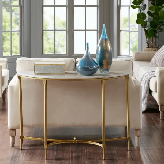 Consola Burj este o piesa in stil modern, cu un aspect deosebit si finisaje de calitate superioara, aceasta poate fi alegerea ideala, moderna si practica. Blatul consolei este confectionat din piatra sinterizata alba, iar baza din metal auriu vopsit in camp electrostatic (fara posibilitatea de a se coji vopseaua), oferind stabilitate si suport. Simpla, dar versatila, consola Burj se integreaza perfect in locuinţa dumneavoastra oferindu-i o nota de eleganţa. Interiorul casei dumneavoastra va fi admirat de cei care indragesc liniile bine definite, simplitatea formelor, dar şi funcţionalitatea acestora.