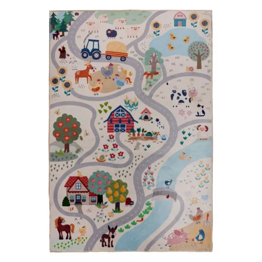 Modelul cu ferma si drumuri pentru masinute aduce un aspect jucaus si plin de culoare in orice camera. Culorile gri, pal, albastru deschis si multicolor se integreaza usor in orice decor, iar dimensiunea generoasa de 160x230 cm asigura spatiu suficient pentru joaca si activitati creative.