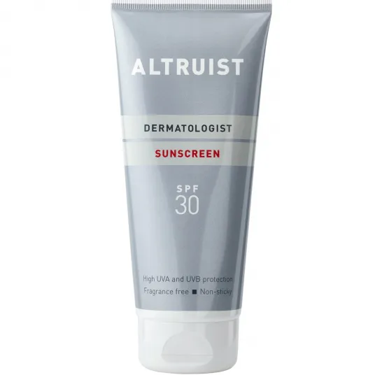 Crema hipoalergenica protectie solara Dermatologist Sunscreen SPF30 Altruist, 200 ml Emulsia usoara a cremei de protectie solara Altruist SPF30 are concentratii optime de filtre solare pentru a evita orice reactie adversa. Asigura protectie mai stricta decat normele europene.Protectie UVA si UVB ridicata. Fara urme albe, se absoarbe usor, nelipicioasa.Testata dermatologic. Fara parabeni sau parfum. Formula hipoalergenica, de inalta toleranta, rezistenta la apa.O gama larga de filtre UV fotostabile si fotostabilizate, inclusiv cel mai avansat disponibil Tinosorb A2B si filtrul mineral sub forma de nano particule, dioxid de titan, asigura eficienta protectiei pe intreg spectrul UVA/UVB. PPD39Ingrediente umectante si hidratante au fost folosite pentru a mentine un nivel optim de hidratare.Poate fi folosita atat pe fata cat si pe corp.Utilizare: Aplicati in fiecare dimineata la finalul rutinei de ingrijire prin miscari circulare usoare si asteptati 10-15 minute sa se absoarba complet inainte de a aplica machiaj. SPF-ul este obligatoriu daca folositi ingrediente active sau proceduri cosmetice care exfoliaza pielea. Aplicati cantitatea corecta de crema pe tot corpul cu cel putin 20 de minute inainte de a iesi in casa pe timpul verii. Reaplicati din doua in doua ore sau dupa fiecare baie.