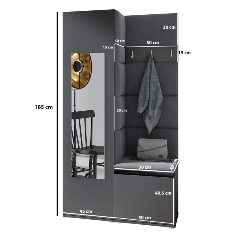 Cuier hol modern ,95 cm lungime, cu dulap haine -oglinda, pantofar si panouri tapitate stofa gri stejar artisan cu negru , Bortis