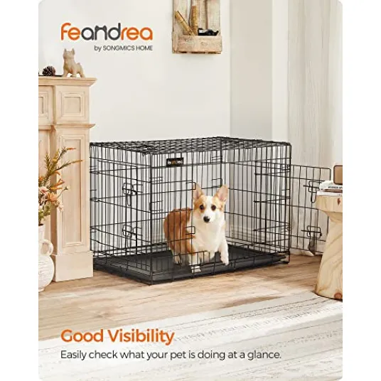 Cusca de caini din sarma, Feandrea, Negru, 92.5x57.5x64 cmSigur si confortabil: Realizata din sarma metalica durabila si rezistenta si finisata cu o suprafata neteda, rezistenta la rugina, fara margini ascutite, aceasta lada mare pentru caini ofera un spatiu sigur si confortabil pentru cainele dvs.<br><br>Usi duble, incuietori duble, securitate dubla: Cu 2 usi, aceasta cusca pentru caini faciliteaza intrarea si iesirea prietenului tau cu blana. Incuietorile duble in forma de L impiedica prietenul dvs. de blana sa deschida singur usile<br><br>Alegeti dimensiunea potrivita: Aceasta lada de sarma pentru caini de 92,5 x 57,5 x 64 cm este ideala pentru caini cu o greutate cuprinsa intre 18-32 kg. Rase recomandate: Pembroke Welsh Corgi, Cocker Spaniel, Foxhound, etc. Va rugam sa cititi sfaturile noastre de masurare din note pentru a alege dimensiunea potrivita<br><br>Usor de asamblat, usor de mutat: Nu este nevoie de unelte, pur si simplu desfasurati-l si atasati incuietorile clipurilor si este gata. Designul pliabil si cele 2 manere din partea superioara il fac usor de transportat<br><br>Usor de curatat: Lada pliabila pentru caini vine cu o tava detasabila in partea de jos, astfel incat sa o puteti glisa cu usurinta pentru curatare si sa pastrati locul cainelui dvs. curat - prietenul dvs. cu blana va va multumi pentru asta!224198600224198600