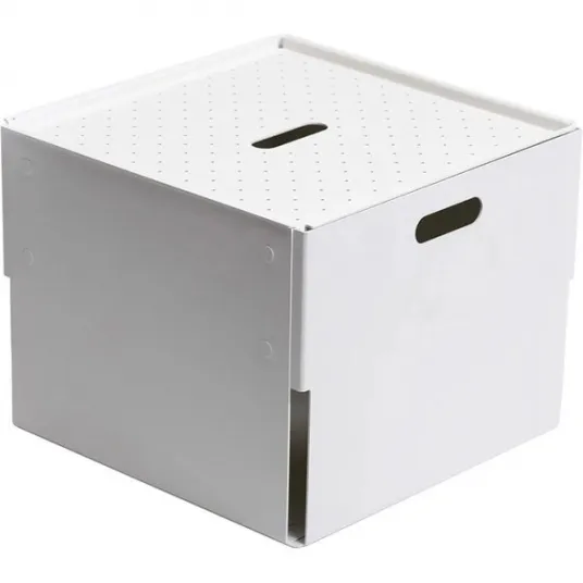 Cutie depozitare Euro XL, 30 x 30 x 22.9 cm, alb Cum numiti o cutie de depozitare atat de eleganta? Raspunsul este „Euro”, cutie de depozitare cu un design urban. Construita din metal taiat cu laser, aceasta piesa puternica vine cu fante eficiente pe ambele parti pentru a o ridica cu usurinta. Aduceti o singura bucata sau cateva dintre aceste cutii acasa si depozitati totul, de la consumabile electrice la instrumente, jucarii, DVD-uri si ziare. Disponibile in diverse culori incitante.