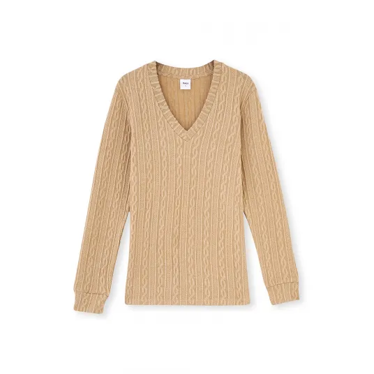 DAGI, Pulover cu decolteu in V si model torsade, Bej, S