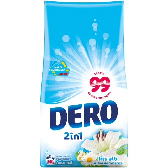 Detergent automat Dero 2in1, Iris alb si flori de romanita, 100 spalari, 10 kg Haine curate, parfum intens, rezultate uimitoare la fiecare spalare! Lasa-te invaluit de prospetimea intensa Dero 2in1 si de parfumul sau extraordinar de iris alb si flori de romanita! Aromele delicate si suave ale celor doua componente olfactive alcatuiesc o oaza de miresme de care te vei indragosti. Beneficii: Haine curate la fiecare folosire;Scoate 99 de pete frecvente;Parfum imbietor si intens;Rezultate uimitoare chiar si la temperaturi scazute. Dozaj recomandat pentru spalarea a 4-5 Kg rufe uscate este de 100g detergent pudra (1 x scoop = 140 ml = 100 g). Pentru spalare manuala diluati 70 ml detergent in 10 l de apa.