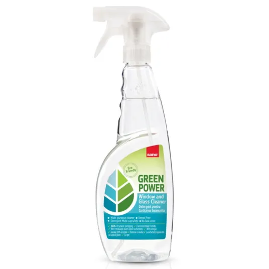 Detergent pentru curatarea geamurilor Sano Green Power, 750 ml Detergent eco-friendly pentru geamuri Detergent lichid universal pentru curatarea si lustruirea geamurilor, oglinzilor, parbrizelor, portelanului, ceramicii, suprafetelor laminate etc.Formula este imbogatita cu otet si permite o curatare usoara fara a lasa urme.Produsul este certificat Green Label de catre the Standards Institution of Israel.Cu surfactanti regenerabili pe baza de plante precum trestia de zahar sau porumbul, biodegradabili.Ambalajul este 100% reciclabil iar cantitatea de plastic din ambalaj este controlata astfel incat impactul sau asupra mediului sa fie scazut.Prietenos cu mediul.Disponibil in ambalaj de 750 ml cu pulverizator.